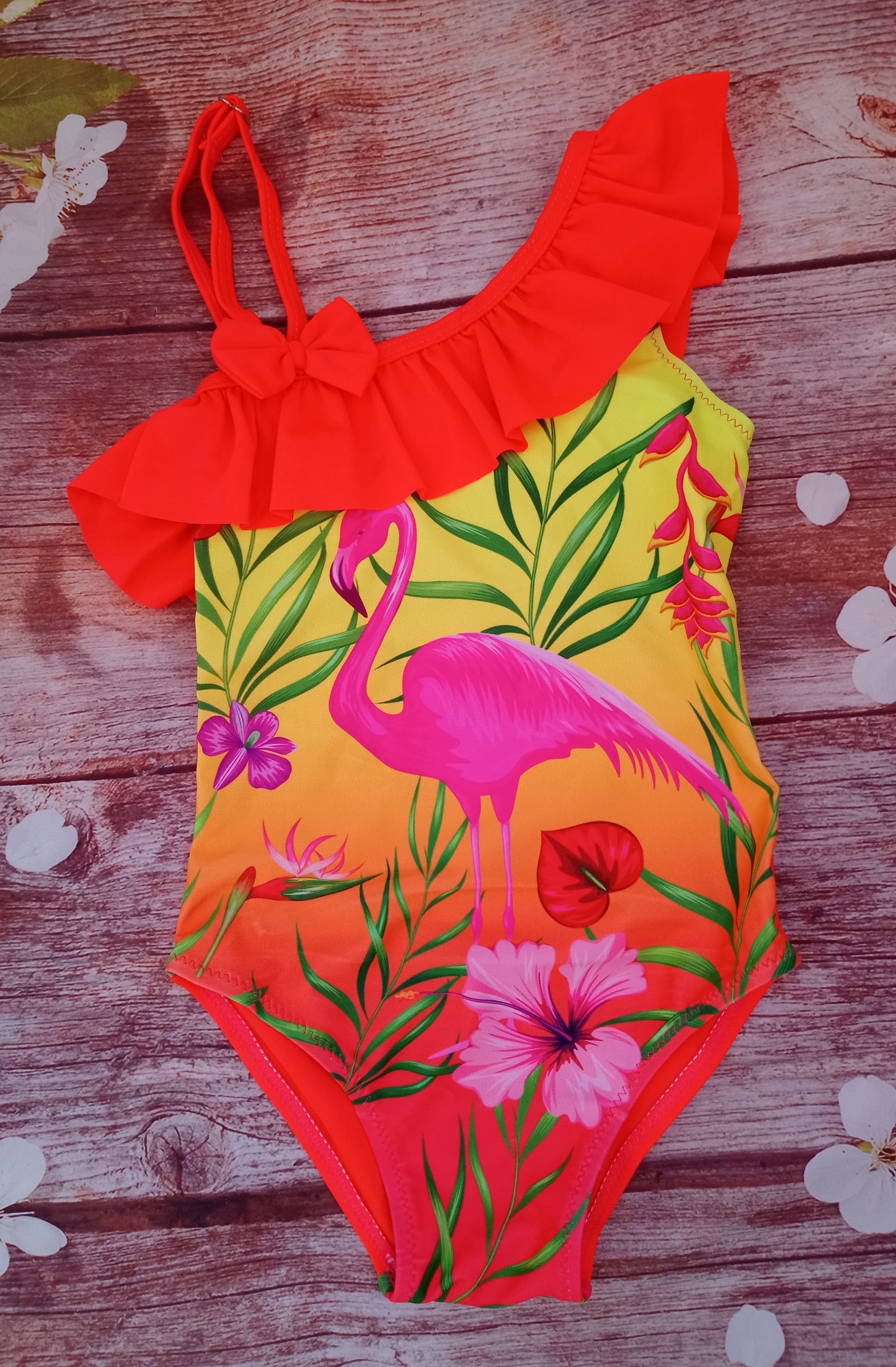 Дитячі суцільні купальники Фламінго Кольори : малиновий , жовтий , помаранчевий Розмірний ряд 28 2-3 роки 92/98 30 4-5 років 104/110 32 5-6 років 110/116 34