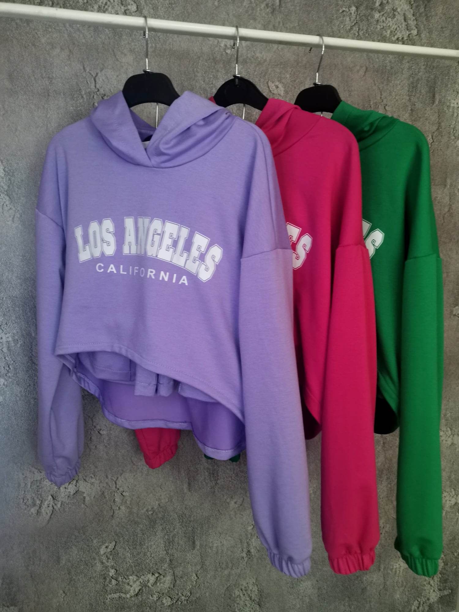 Крутий літній костюм 3-ка Los Angeles  Вільне укорочене спереду худі , на спинці подовжене Короткий топ та шорти